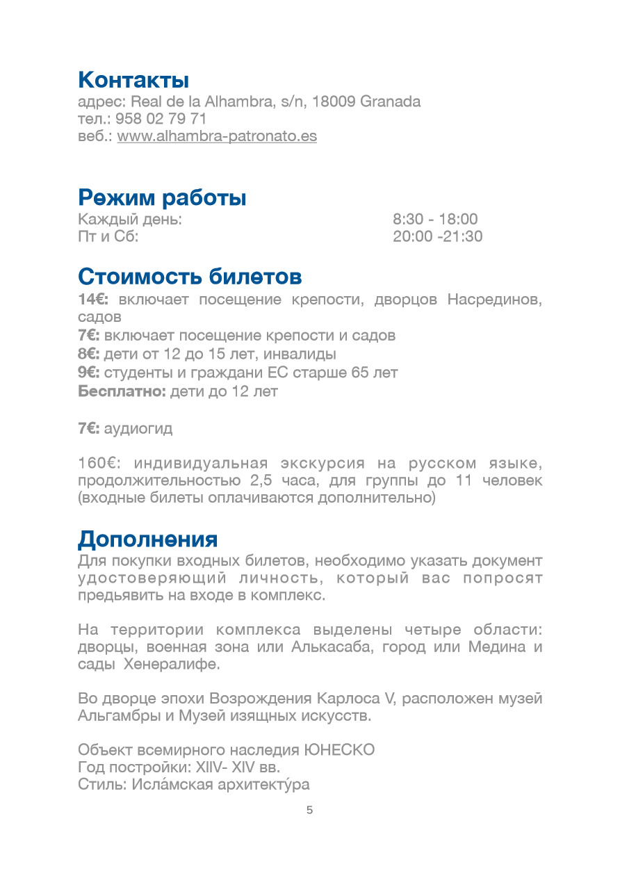 Вам больше не нужно искать информацию: «что делать в Гранаде». Электронный справочник по городу Гранада, включает: 49 достопримечательностей, фотографии, адреса, рабочее расписание, стоимость билетов, в том числе льготных, контактную и дополнительную информацию — это поможет эффективно спланировать время и бюджет путешествия.